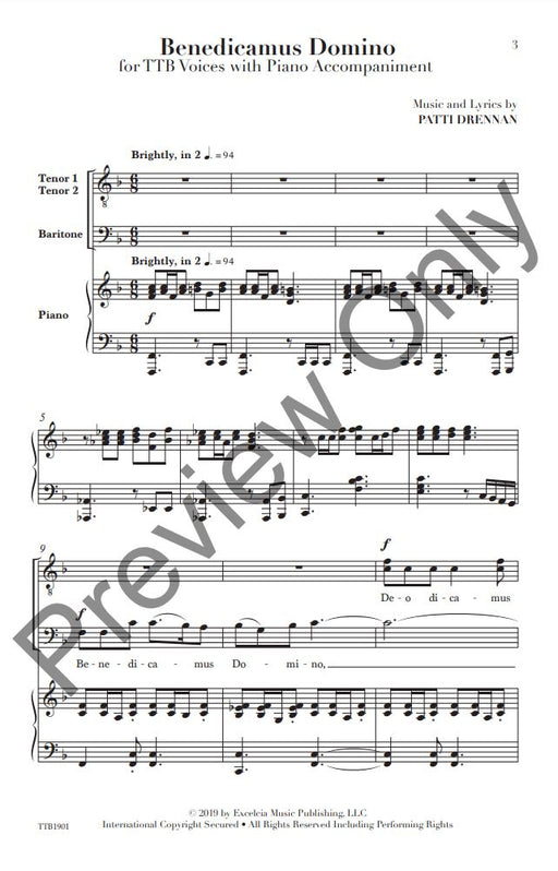 樂器: men's choir (TTB) and piano出版社: Excelcia Music Publishing原文簡介: 帕蒂-德倫南(Patti Drennan)創作的這首充滿活力的拉丁文 TTB 樂曲,可以讓指揮們盡情發揮!這首曲子非常適合音樂節、比賽和音樂會,其聲樂音域適合歌...