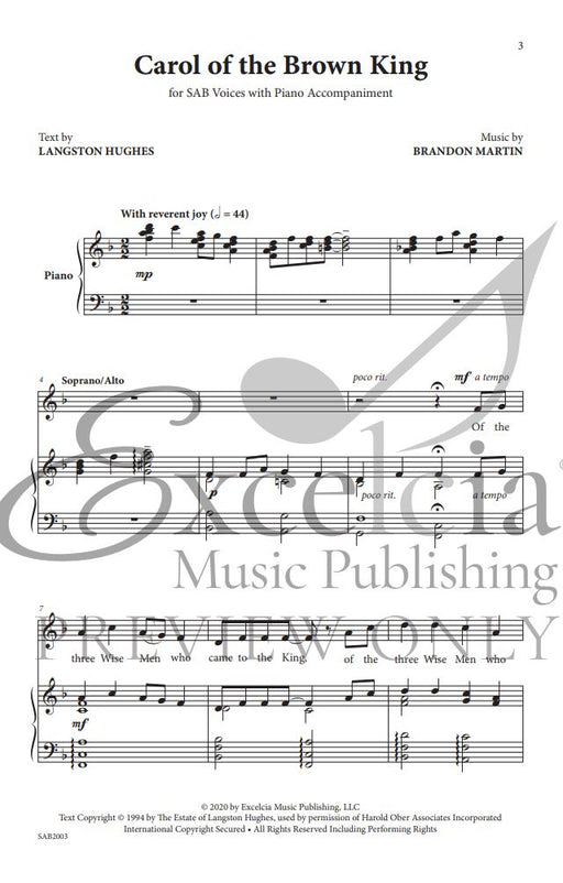 樂器: choir (SAB) and piano出版社: Excelcia Music Publishing原文簡介: 蘭斯頓-休斯(Langston Hughes)的這首著名詩歌被配上了優美的音樂,為學校、教堂或社區的任何音樂會增色不少。布蘭登-馬丁是合唱界一顆冉冉升起的新星。曲目: 頁數...