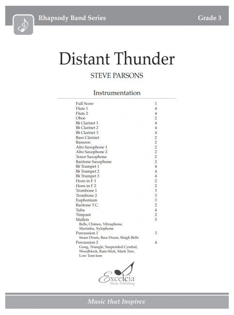 樂器: wind band出版社: Excelcia Music Publishing原文簡介: 遙遠的雷聲》描繪了一個瞬息萬變的雨林世界,閃爍的紋理就像雨水打在樹葉上發出的光芒,又像狂風暴雨發出的隆隆巨響。這首極富戲劇性的作品採用了充滿活力的切分節奏和簡單的混合節拍模式,旨在展示打擊樂的魅力...