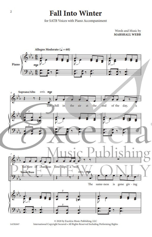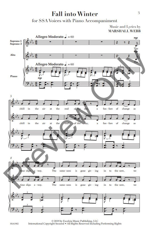 樂器: female choir (SSA) and piano出版社: Excelcia Music Publishing原文簡介: 秋去冬來》內涵豐富,音樂瞬間平易近人,是初中或高中 SSA 合唱團的最佳選擇。作曲家馬歇爾-韋伯(Marshall Webb)創作了一首優美的樂曲。音樂家和聽...