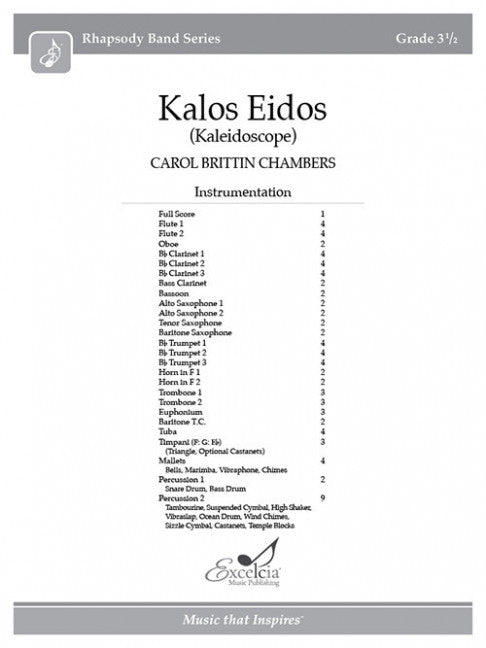 樂器: wind band出版社: Excelcia Music Publishing原文簡介: Kalos Eidos》是一部令人愉悅的程式化作品,旨在用音樂描繪萬花筒的特徵。卡羅爾設想了各種顏色和圖案,並將它們巧妙地表現在現代樂隊中。巧妙的樂段在樂隊中交織,給音樂家和觀眾帶來了無窮的樂趣。...