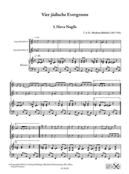 Vier jüdische Evergreens für 2 Sopranblockflöten und Klavier