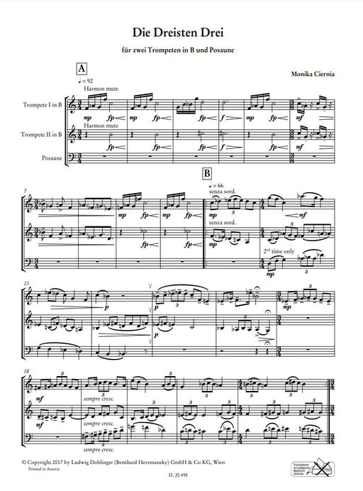 樂器: 2 trumpets and trombone出版社: Musikverlag Doblinger原文簡介: Die Dreisten Drei 是一個三重奏小組,在嚴肅與惡作劇、維也納與墨西哥之間穿梭,充滿了詼諧幽默......。... 這部作品之所以 "大膽",是因為它不在乎新音樂...