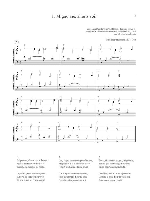 作曲家: 改編者: Mandelartz Monika校訂者: Author: 樂器: 2 harps出版社: Schell Musikverlag原文簡介: 這一卷 Mignonne...allons voir 收集了 16 世紀法國流行音樂的新編曲。這些改編曲是為兩把現代凱爾特豎琴...