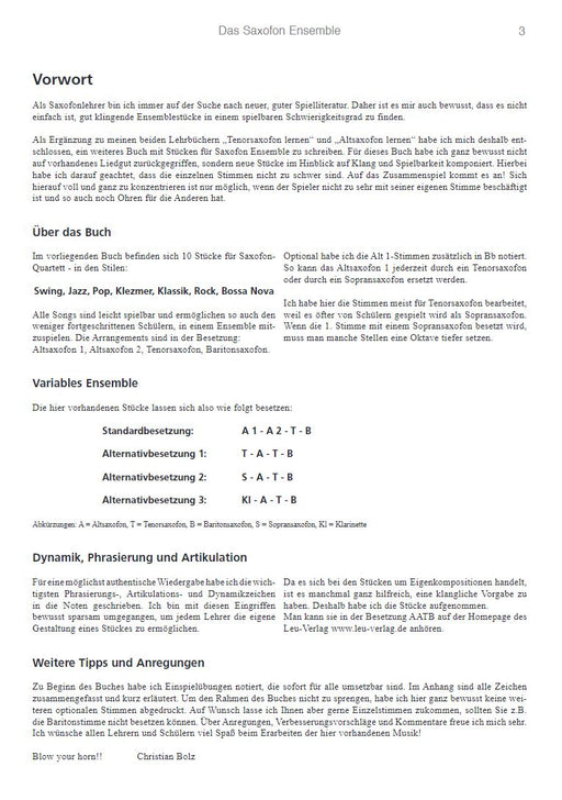 樂器: 4 saxophones (AATBar)出版社: Leu Verlag原文簡介: 薩克斯合奏》是一本為音樂會和試奏而編寫的演奏手冊,其中包含有趣的現代演奏曲目。書中收錄了 10 首曲目,風格包括搖滾、搖擺、爵士、克萊茲梅爾、波薩諾瓦和古典音樂,以及合奏的寶貴技巧。所有樂曲的創作都考慮...
