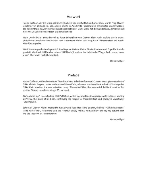 作曲家: Holliger Heinz改編者: 校訂者: Author: 樂器: viola出版社: Schott Music原文簡介: 海因茨-霍利格(Heinz Holliger)在他的 Herbstblatt 中追溯了在奧斯威辛-菲斯滕瑙集中營被殺害的作曲家吉迪恩-克萊因的生平。...