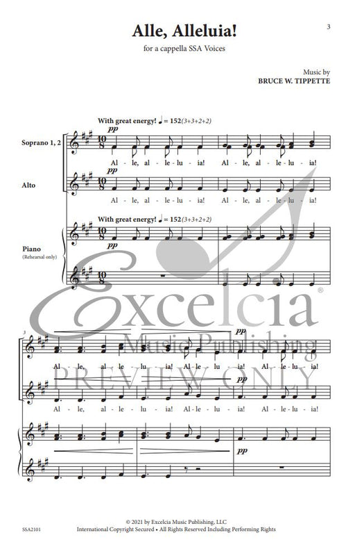 樂器: female choir (SSA) a cappella出版社: Excelcia Music Publishing原文簡介: Alle, Alleluia》是一首有趣而令人興奮的作品,適合在音樂會或節日期間使用,是向前進中的合唱團介紹混合音高的絕佳作品。聲部音域易於掌握,因此這首精...