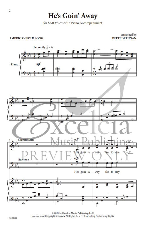 作曲家: 改編者: Drennan Patti Janell校訂者: Author: 樂器: choir (SAB) and piano出版社: Excelcia Music Publishing原文簡介: He's Goin' Away》是一首著名的民謠旋律,為 SAB 聲部編曲,和...