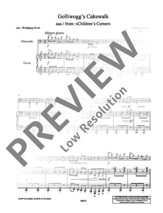 The famous Golliwoggs Cakewalk is the final piece from Debussy's cycle Childrens Corner which consists of 6 miniatures for piano, written for his daughter in the years 1906-1908.The style corresponds to that of ragtime, a dance which was in vogue around the turn of the century. In the middle section, he parodies several times the beginning of the opera Tristan and Isolde by Richard Wagner with whom Debussy had a rather ambiguous relationship.The present arrangement now allows musicians to play the popular movement in a version for melodic instrument with accompaniment.