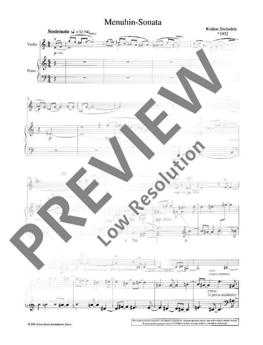 Sir Yehudi Menuhin, who died in March 1999, was both the founder and for 40 years the guiding spirit of the summer music festival that is named after him in the Swiss town of Gstaad. The Gstaad festival commissioned the Russian composer Rodion Shchedrin (b. 1932) to write the Menuhin-Sonata as a memorial to the great violinist. Dmitry Sitkovetsky (Violin) and Michel Dalberto (Piano) premiered the piece in Saanen – a suitable musical hommage and tribute to one of the most influential musical personalities of the 20th century.