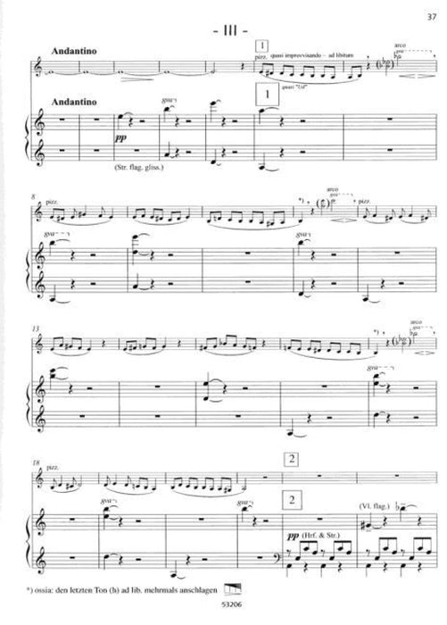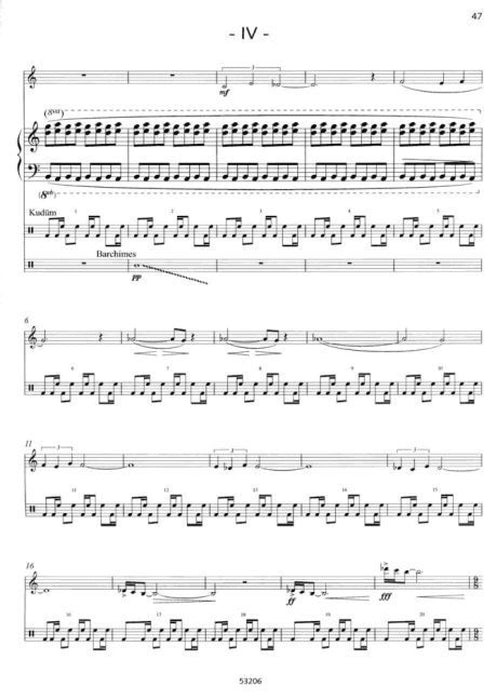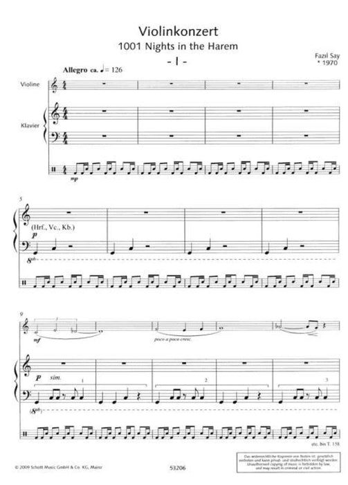 My Violin Concerto consists of four movements whose inspiration is loosely connected with Scheherazades One Thousand and One Nights. The first movement is set inside the harem; a variety of women from the harem are introduced, each with her own different personality. The second movement is a frenzy of dance in effect a party night with an abundance of different types of dance music. The third movement depicts the next morning and consists primarily of variations on a well-known Turkish song. The fourth movement begins dramatically, but develops during the course of the movement more and more into a reminiscence of all the previous events and the work culminates dreamily in a happy mood with sensuous oriental sounds.As appropriate for an oriental soundscape, the orchestra includes a series of Turkish percussion instruments such as a kudüm or bendir, but also glockenspiel, marimba und vibraphone, celesta and harp. It is however the solo violin which tells the story and also accompanies the listener through the entire work. The violin part is highly virtuoso and unites the four movements into an intensely atmospheric whole in which the solo violin soars off into a solo cadenza between each movement, sometimes accompanied by one of the percussion instruments.As is customary, the present piano reduction is initially intended as an aid for the study of this work, but during my tour programmes with Patricia Kopatchinskaya and Burhan Öçal we have utilised this material to create a trio version for violin, piano and percussion. Faz?l Say