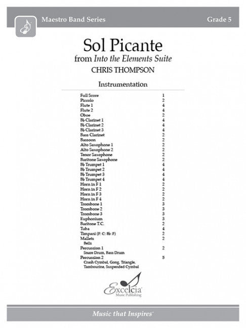 樂器: wind band出版社: Excelcia Music Publishing原文簡介: 歡迎辛辣的太陽Sol Picante》是作曲家克裡斯-湯普森即將推出的組曲中的一個樂章。這部音樂會樂隊作品充滿了門寧式的音色,非常適合所有音樂會節目。大量獨立和外露的音色為樂隊帶來了美妙的色彩和聲...