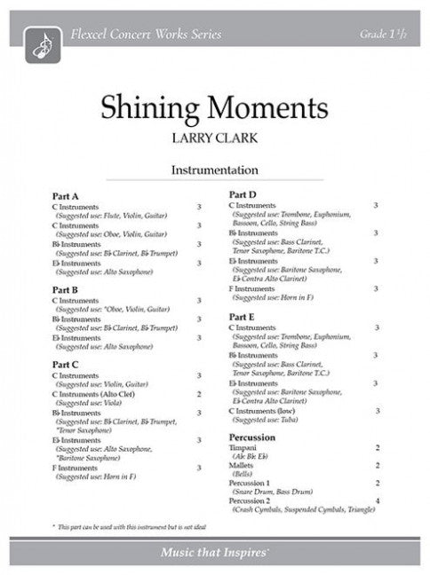 樂器: 5 melody instruments and percussion出版社: Excelcia Music Publishing原文簡介: 閃亮時刻》是一首美妙的勵志民謠,適合靈活合奏。只需 5 名管樂/弦樂手和打擊樂手即可演奏。每首 Flexcel 系列作品都附有版權許可證明信和數...