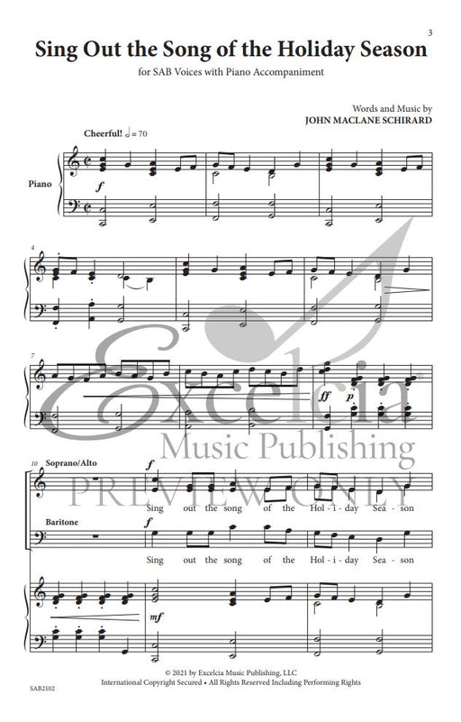 樂器: choir (SAB) and piano出版社: Excelcia Music Publishing原文簡介: 這首新的節日樂曲將是冬季音樂會的完美節奏補充。編曲人約翰-麥克萊恩-施拉德(John Maclane Schirard)在這首曲子中加入了有趣的歌詞和令人興奮的調性變化,學...