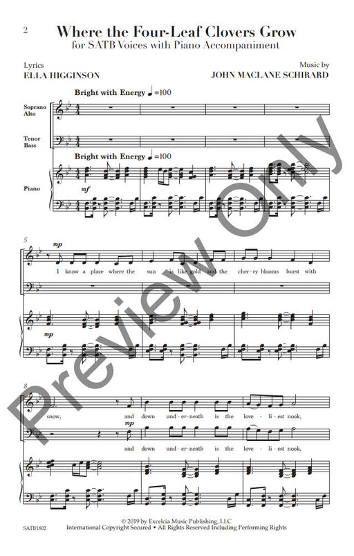樂器: choir (SATB) and piano出版社: Excelcia Music Publishing原文簡介: 作曲家約翰-麥克萊恩-席拉德(John Maclane Schirard)根據艾拉-希金森(Ella Higginson)的詩歌創作了這首優美的作品。四葉草生長的地方》非...