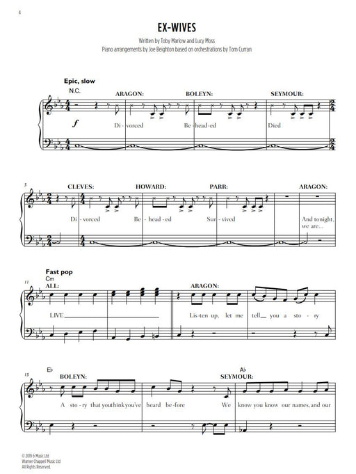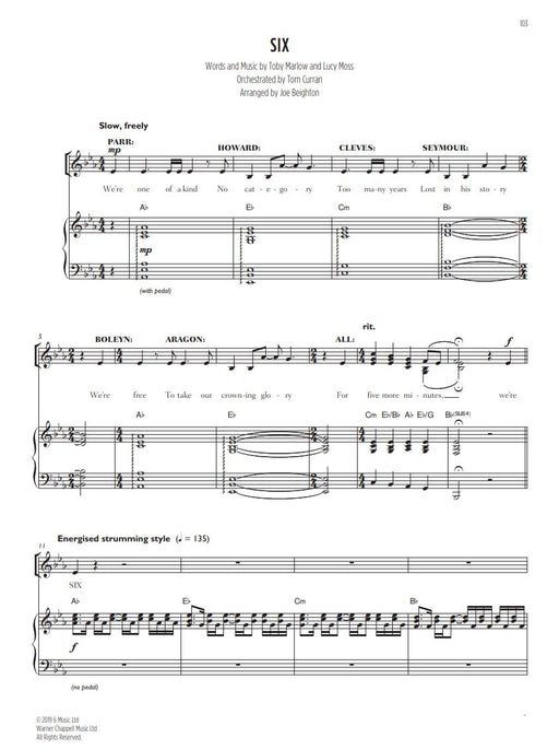 樂器: voice and piano出版社: Faber Music原文簡介: 托比-馬婁(Toby Marlow)和露西-莫斯(Lucy Moss)的音樂劇《SIX》被譽為 英國新音樂劇中最振奮人心的作品(《標準晚報》),成為人人為之瘋狂的現象!這部令人陶醉的音樂劇講述了亨利八世的六位妻子...