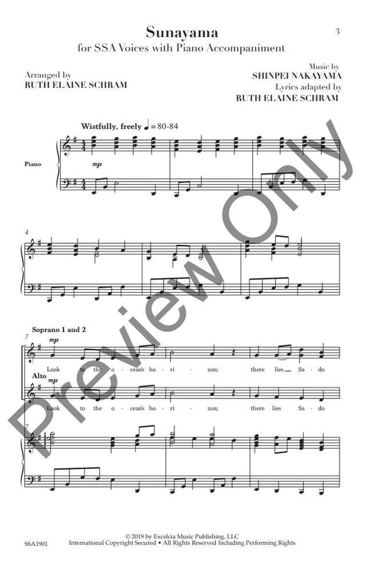 作曲家: 改編者: Schram Ruth Elaine校訂者: Author: 樂器: female choir (SSA) and piano出版社: Excelcia Music Publishing原文簡介: Sunayama 是一首優美的日本民謠。作曲家露絲-伊萊恩-施拉姆(...