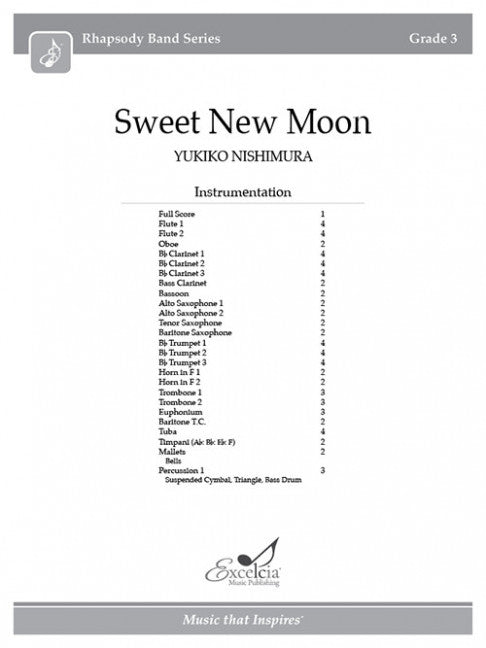 樂器: string orchestra出版社: Excelcia Music Publishing原文簡介: 有人說,當你在新月下許願時,你的願望就會實現。作曲家西村幸子為年輕音樂家們精心創作了這首感情真摯的作品。豐富的和聲與懸念將充分展現演奏者的音樂才華。非常適合任何音樂會或活動。曲目: ...