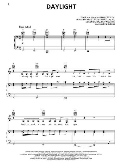 樂器: piano, voice, guitar出版社: Hal Leonard原文簡介: 這套為鋼琴和聲樂編配的曲集配有吉他和絃框架,可演奏 13 首年度最熱門的歌曲。從麥莉-賽勒斯(Miley Cyrus)的《花兒》到奧利維亞-羅德里戈(Olivia Rodrigo)的《吸血鬼》,你都能在...